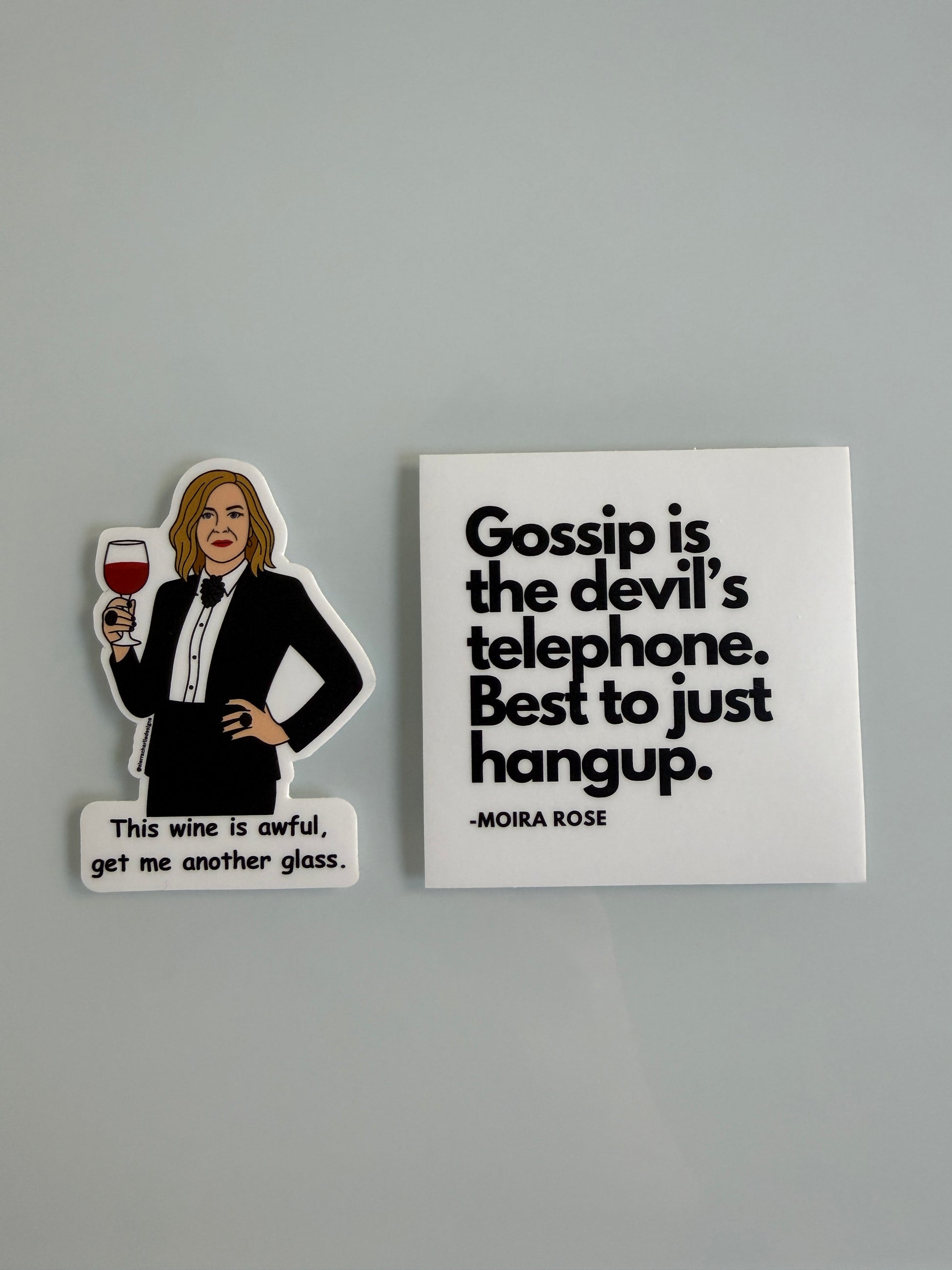 This Moira Rose sticker pack celebrates one of the most iconic characters in comedy. Featuring two witty designs inspired by everyone’s favorite small-town socialite, these stickers are perfect for laptops, water bottles, notebooks, wine tumblers, and anywhere that could use a little extra personality.