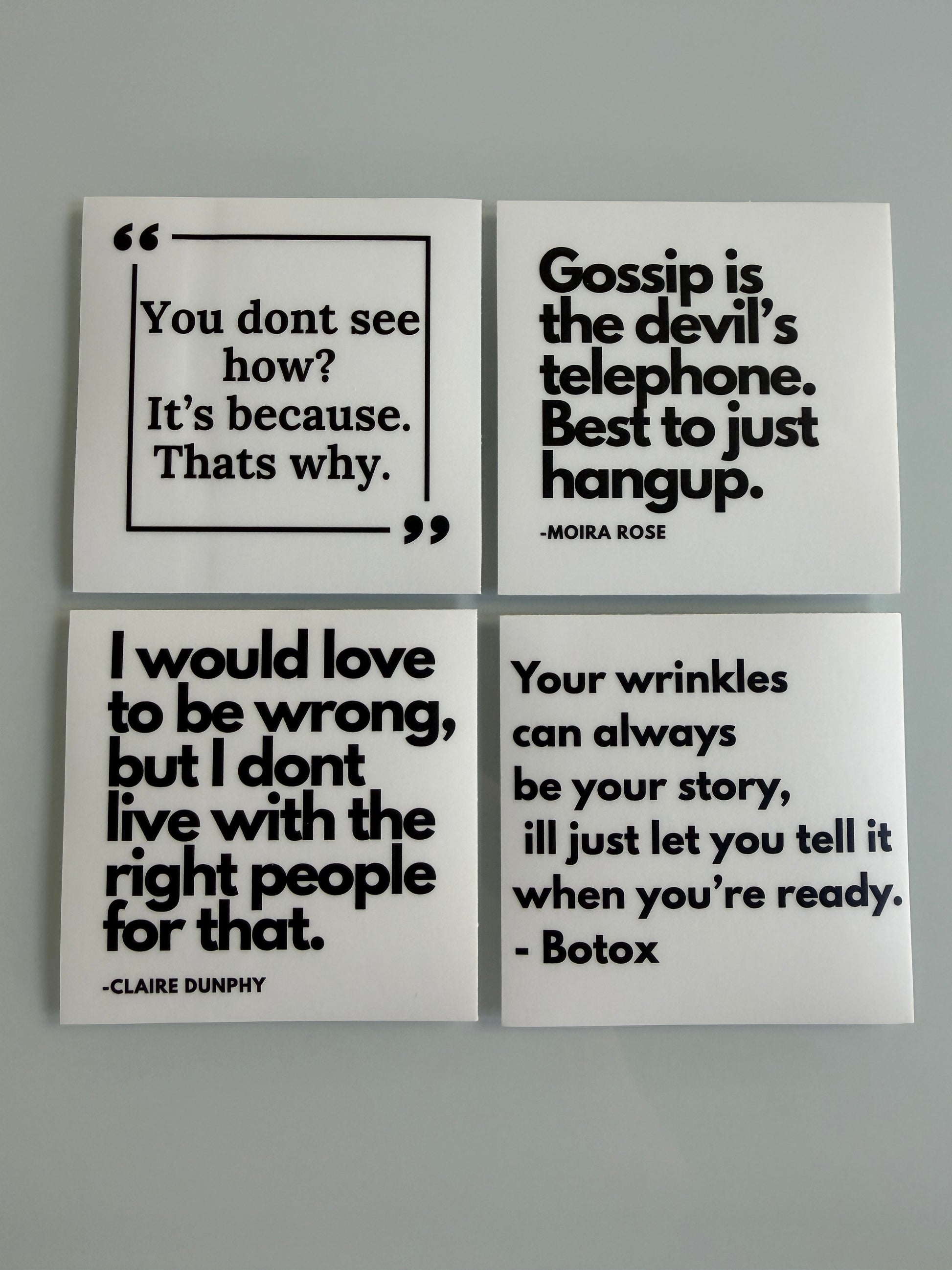 Add a little sarcasm and personality wherever you stick these. This 4-pack features four bold, witty quotes perfect for laptops, water bottles, notebooks, planners, or anywhere that could use a dose of humor.